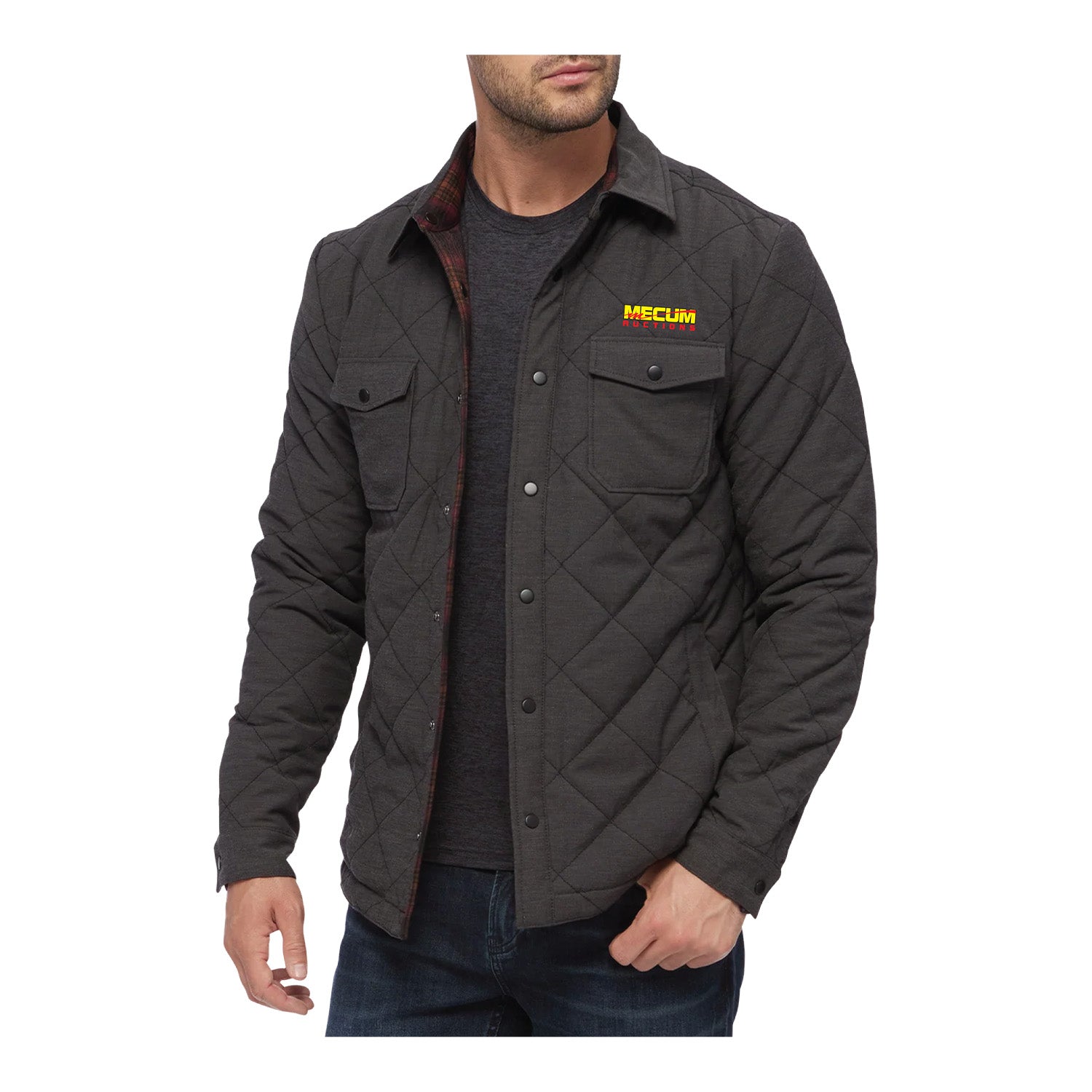 This Mecum Auctions Grey Chapin Flannel Quilted Jacket is made of 70% polyester, 22% cotton, and 8% spandex. It features a embroidered design on the left chest.