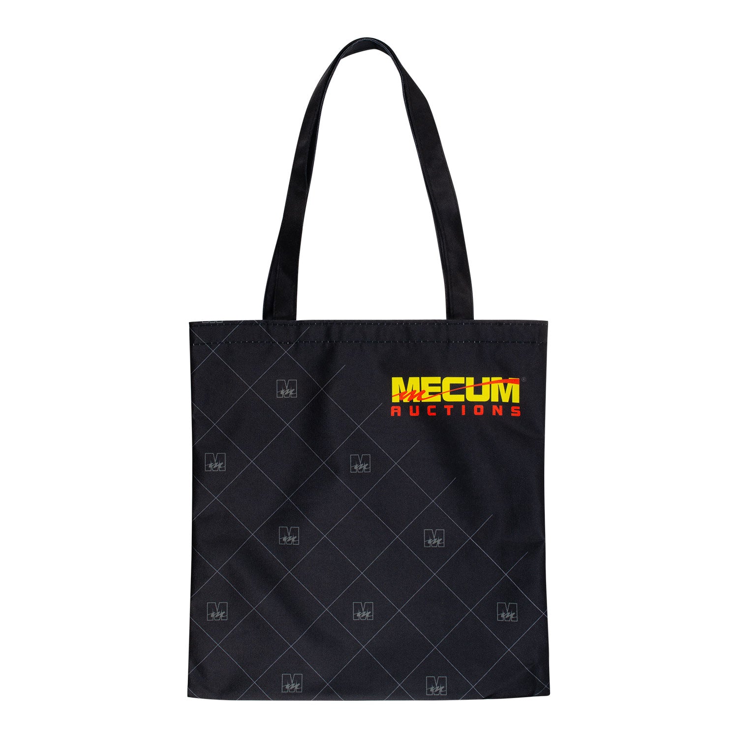 This Mecum Auctions Black Tote Bag features a large main pocket. It showcases the Mecum Auctions Logo on the front with M Block Logos scattered throughout. 100% Cotton